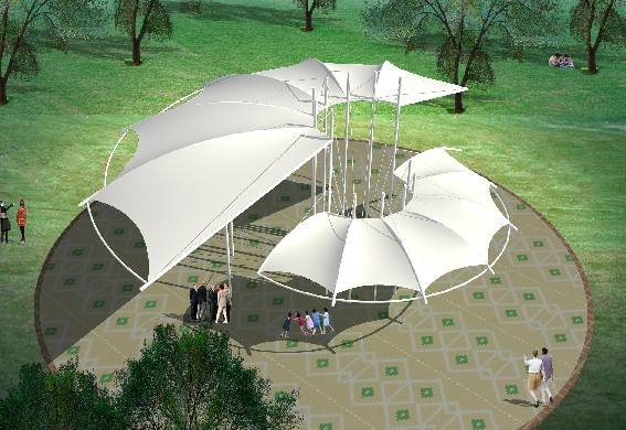 一個城市的中心區(qū)反映一個城市的地理風(fēng)貌和民族風(fēng)情,同時,也是一個城市文化發(fā)展程度的標(biāo)志。而景觀設(shè)計要求其具有廣泛的可讀性、雅俗共賞,既有超凡脫俗的藝術(shù)價值,又能使大眾喜聞樂見與大眾息息相通。膜結(jié)構(gòu)以其輕盈飄逸的造型、柔美并帶有力量的曲線和大跨度和大空間的鮮明個性和標(biāo)識性,應(yīng)用于城市小品設(shè)計中。